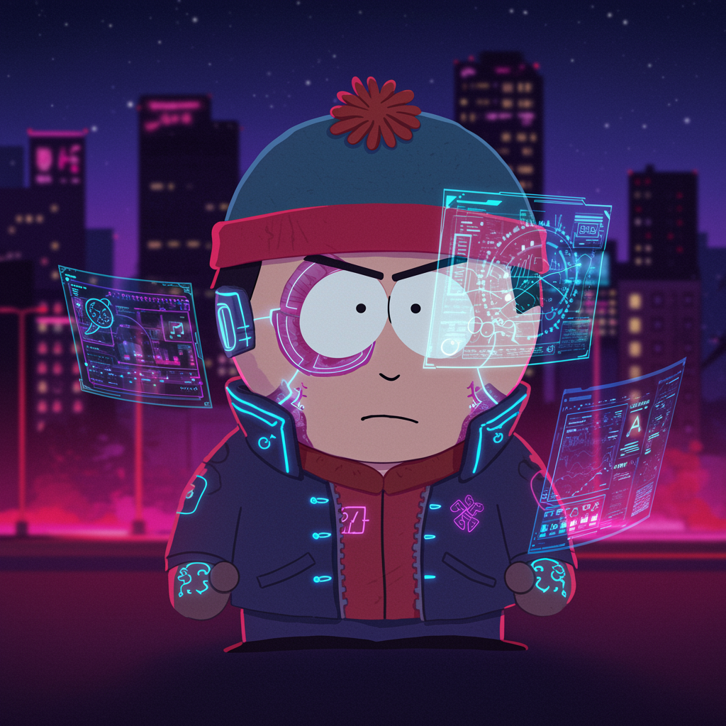 "Create an image of Stan Marsh from South Park wearing futuristic cyberpunk attire, complete with neon lights and digital tattoos, set against a vibrant cityscape at night. His iconic hat glows with luminescent threads, and his eyes are focused with a determined gaze, reflecting the light from hovering holographic screens. This dynamic and colorful portrayal captures Stan’s essence while blending in elements of a tech-savvy, modern world, making it an eye-catching profile picture for fans."