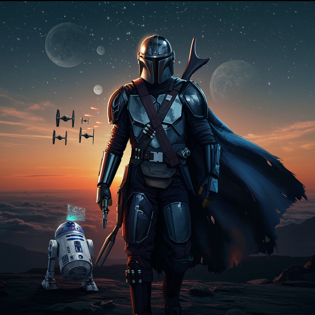 "Imagine a Star Wars-inspired profile picture where a fierce Mandalorian warrior, cloaked in a shimmering nebula cape, stands on a distant planet's horizon at twilight. Their visor reflects a cosmic battle scene with TIE fighters and X-wings clashing in a dance of light. In the backdrop, dual moons glow softly, casting ethereal shadows, while a small, cheeky droid hovers nearby, projecting a holographic star map. The image captures an epic blend of galactic adventure and personal mystery, perfect for a social media pfp."
