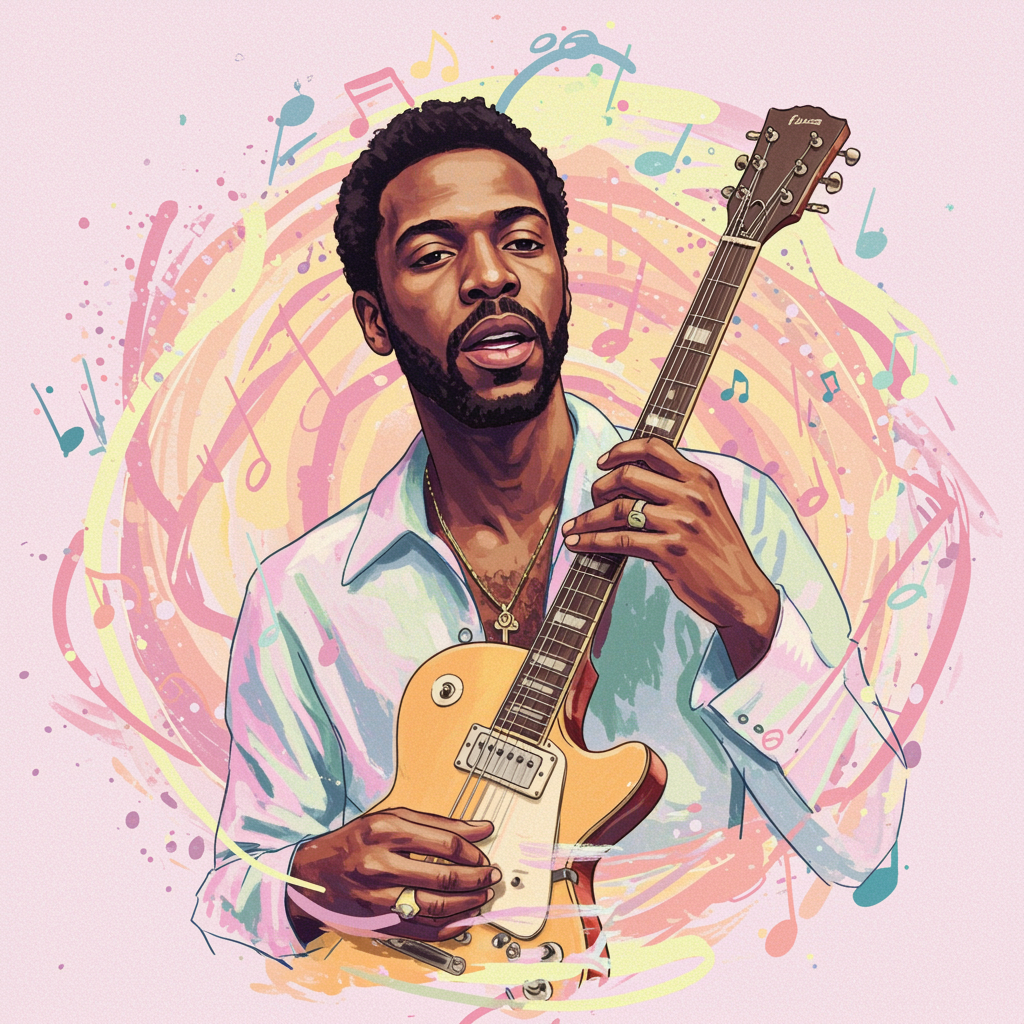 A vibrant digital illustration of Steve Lacy surrounded by a kaleidoscope of musical notes and abstract patterns, with his signature guitar in hand, exuding an aura of cool confidence and creative energy; the background is a swirling mix of pastel colors, reflecting his eclectic style and artistic spirit, while his expression is a playful blend of mystery and charisma, perfect for a standout profile picture.