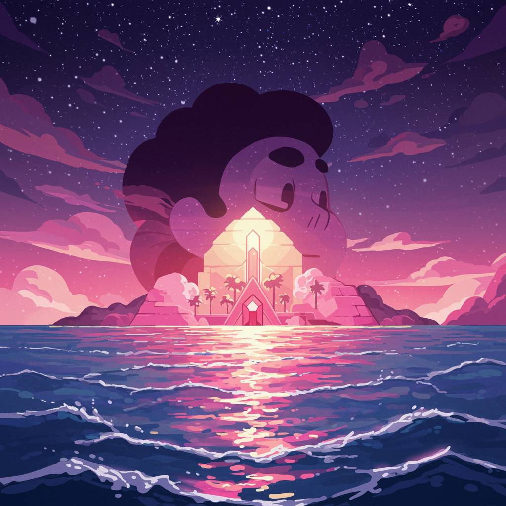 A vibrant and whimsical Steven Universe-inspired profile picture capturing the essence of a sparkling, starry night sky reflected in the gentle waves of Beach City, with a subtle silhouette of Steven's face, framed by iconic elements like the rose quartz gem and the bright glow of the temple, exuding an aura of magic and adventure.