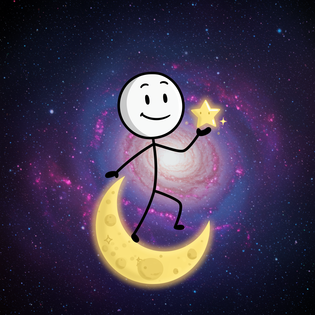 Imagine a whimsical stickman character radiating charisma against a vibrant, swirling galaxy backdrop; its simple form animated by a cheeky smile and playful pose, holding a tiny, glowing star in one hand while balancing on a delicate crescent moon, embodying the magical charm of a cosmic being ready to represent the user's unique online persona.