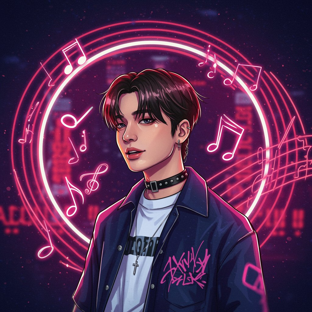 A vibrant and dynamic profile picture set against a backdrop of swirling neon city lights, featuring a stylized cartoon rendition of a member from the band Stray Kids, exuding confidence and youthful energy, with graffiti-style musical notes and symbols subtly integrated into the background to reflect their urban, audacious spirit.