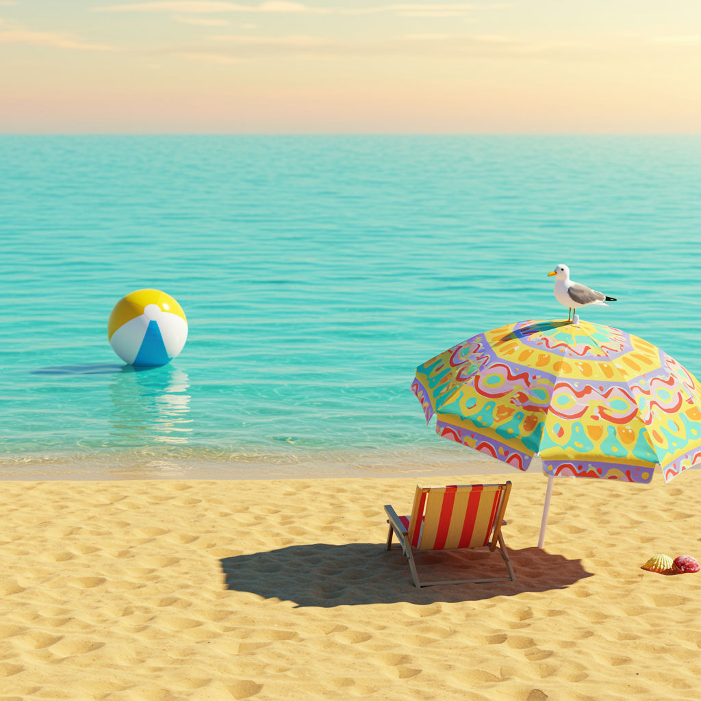 Imagine a sun-kissed scene where a vibrant beach ball floats serenely on turquoise waters; in the foreground, a playful seagull perches on a brightly patterned beach umbrella, casting a whimsical shadow on the golden sands below. The horizon is a kaleidoscope of soft pastel hues as the sun sets, creating a dreamy backdrop. This lively snapshot, bursting with summer essence, frames the carefree spirit of a perfect summer day, capturing the playful joy and relaxation synonymous with the season.