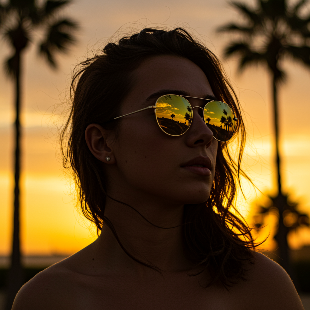 A serene portrait of a mysterious figure bathed in the warm glow of a golden sunset, their silhouette framed by lush palm trees, with wind-swept hair flowing like gentle waves; they wear reflective sunglasses that capture the fleeting colors of the sky, embodying the dreamy essence of endless summer adventures.