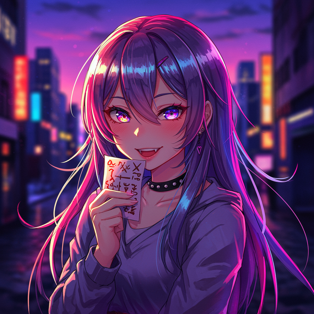 A vibrant anime girl with mischievous eyes, her expression playful yet enigmatic, is set against a bustling cityscape at twilight. Her long flowing hair merges with the neon lights that illuminate the urban scene, casting colorful reflections onto her smooth, expressive face. She holds a cryptic note in her hand, partially visible with symbols that beckon curiosity, while a sly smirk dances on her lips, suggesting she knows a secret she might—or might not—reveal. The background hums with a sense of mystery and anticipation, and subtle elements hint at a story yet untold.