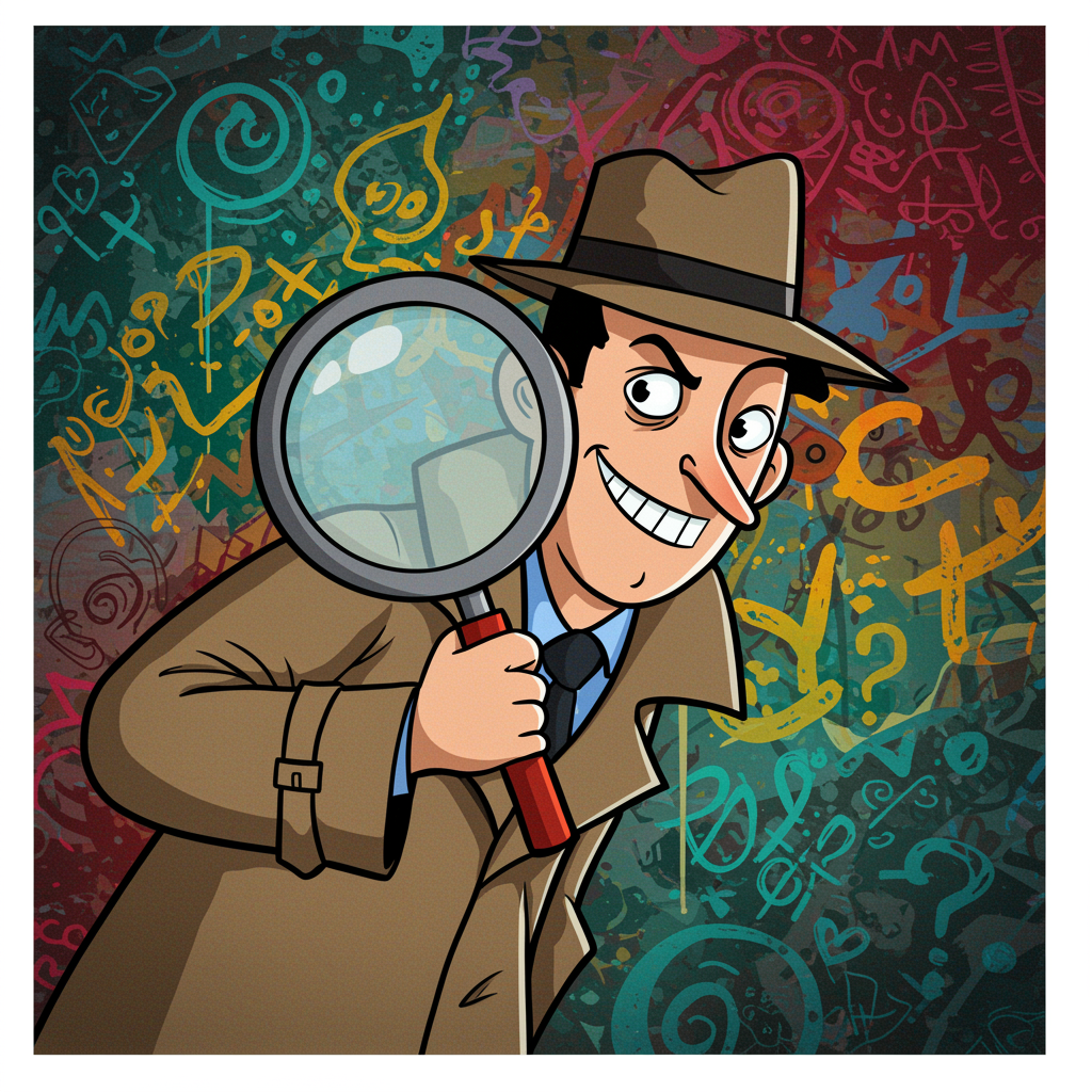 A mischievous cartoon detective with a magnifying glass peers out from the corner of the profile picture, wearing a sly smirk and oversized trench coat, against a backdrop of vibrant graffiti art filled with mysterious symbols and playful hidden clues, evoking a sense of playful suspicion and intrigue.