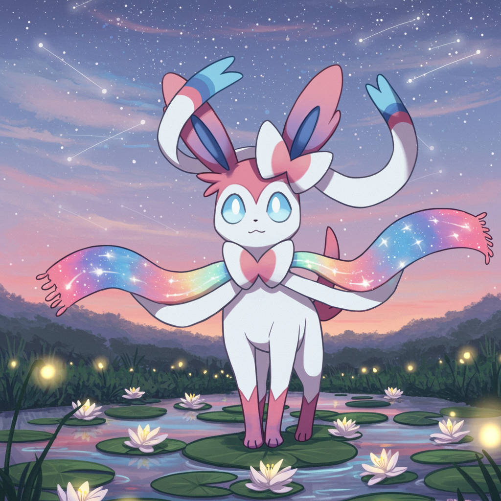 Imagine a sylveon elegantly draped with a vibrant, pastel scarf that appears to be woven from shooting stars, glimmers of moonlight dancing in its eyes as it stands poised atop a gently flowing stream surrounded by luminescent lilies. In the background, a soft, ethereal twilight sky is sprinkled with fading constellations, creating a serene and mystical atmosphere. This whimsical scene perfectly captures the enchanting essence of sylveon, making it an ideal pfp that exudes charm and dreamlike wonder.