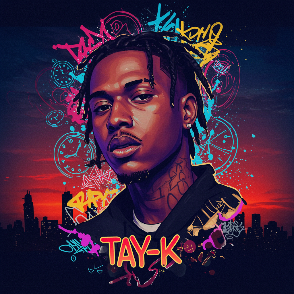 A vibrant and dynamic profile picture capturing the essence of Tay-K, featuring a stylized portrait of the artist with an enigmatic expression that blends defiance and introspection, surrounded by abstract graffiti elements in bold neon colors that symbolize the urban energy and raw creativity of his music, with subtle references to time, like swirling clocks or shattered hourglasses, to evoke the complex narrative of his journey, set against a backdrop of cityscapes at twilight to highlight the contrast between shadows and brilliance.