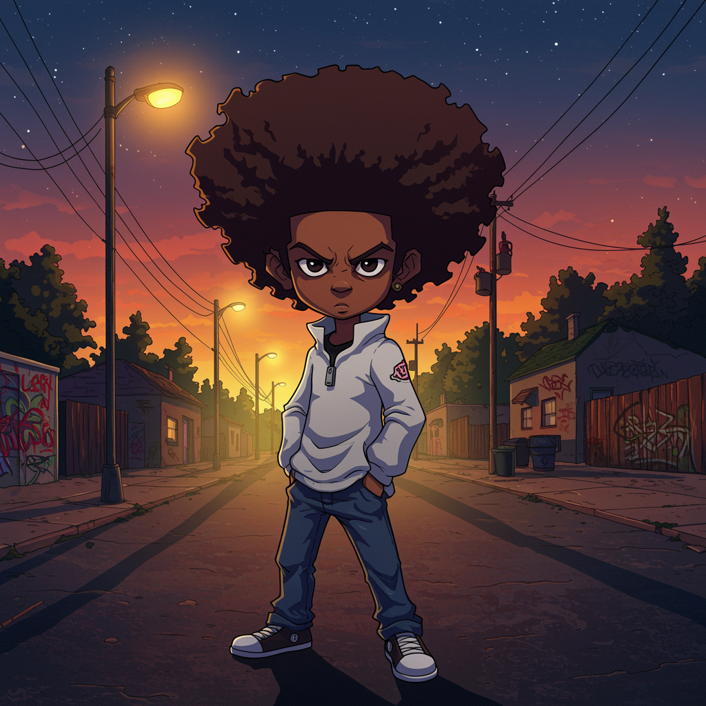 A vibrant and dynamic profile picture inspired by "The Boondocks," featuring a stylized animated character with a defiant expression, standing against a backdrop of a lively urban neighborhood at twilight, the scene adorned with graffiti art and warm streetlights casting long shadows across the pavement, capturing the essence of rebellion and cultural identity, with the character sporting iconic afro hair and dressed in a blend of modern and retro streetwear, exuding confidence and attitude in every brushstroke.