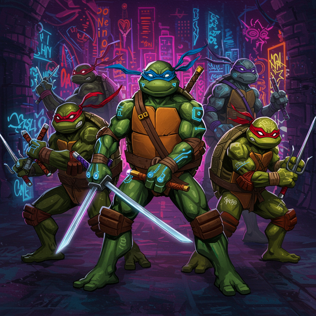 "Imagine a sleek fusion of Teenage Mutant Ninja Turtles and modern street art for the perfect pfp: Leonardo, Michelangelo, Donatello, and Raphael posing with vibrant graffiti-inspired patterns surrounding them, each turtle is styled with subtle tech enhancements symbolizing their unique traits—Leonadro wielding an energy-infused katana, Michelangelo with luminous nunchucks that create a trail of light, Donatello wearing high-tech goggles that glow with data streams, and Raphael's sais pulsing with fiery energy, all set against a backdrop of neon city lights merging seamlessly with their classic sewer lair, capturing the essence of youthful rebellion and urban adventure."