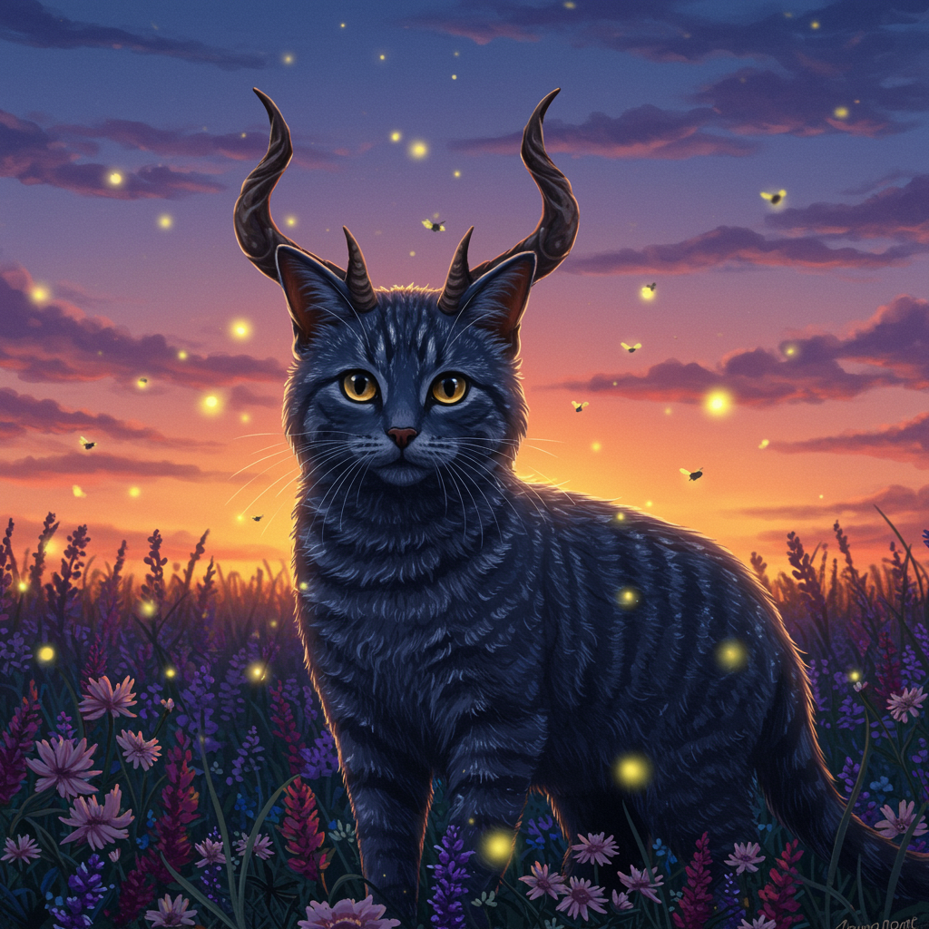 Imagine a whimsical scene where a majestic cat, adorned with a pair of strikingly ornate bull horns, stands in a field of vibrant wildflowers under a twilight sky. The cat's fur is a mix of deep, midnight blues and iridescent silvers, mimicking a starry night. Its eyes glow with an enchanting golden hue, reflecting the warm, fading sunlight. Surrounding the cat are fluttering fireflies, leaving trails of soft luminescence in the air, creating a magical aura. This striking image perfectly captures the essence of a "toro cat" and serves as a captivating and mystical profile picture.