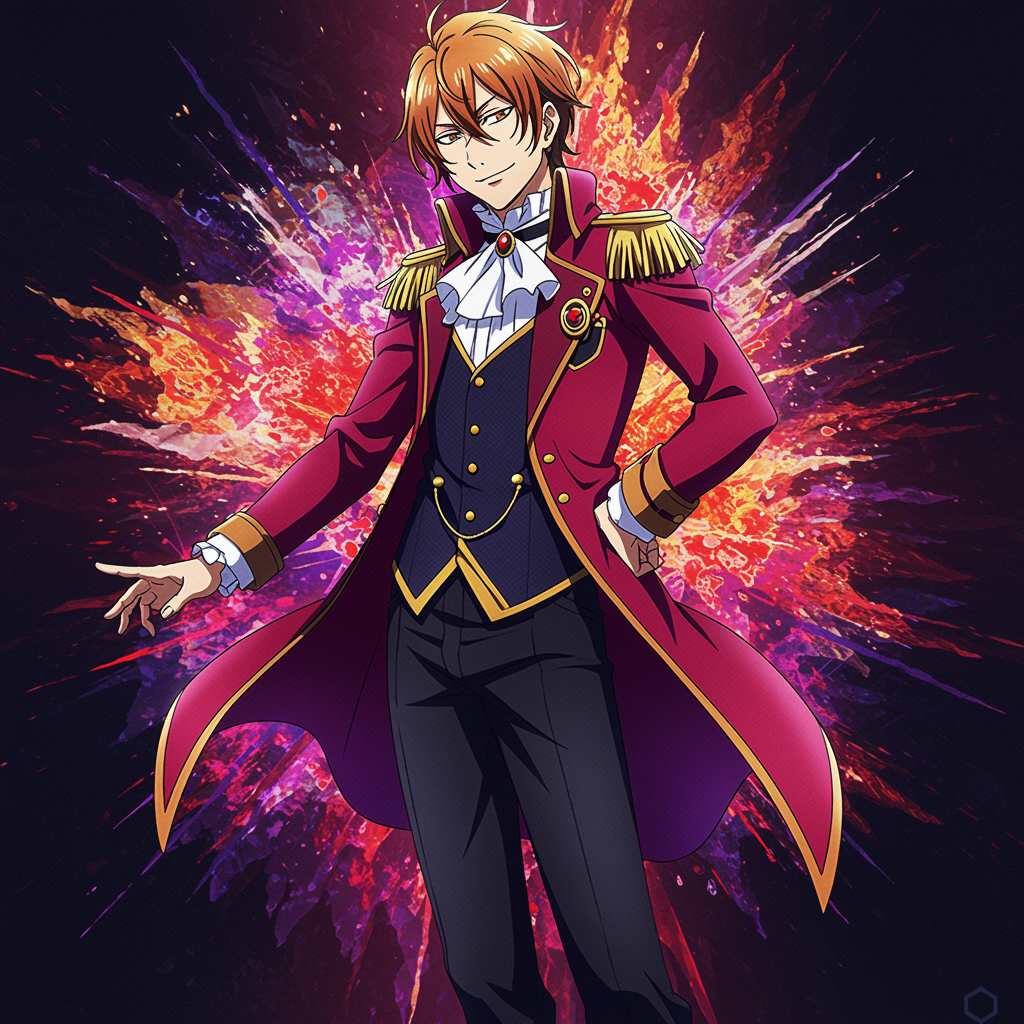 "Envision a vibrant and dynamic profile picture featuring Tsukasa Tenma, a character brought to life through an explosion of colors and dramatic lighting. Imagine Tsukasa standing confidently, capturing his charismatic and slightly mischievous persona, with his iconic outfit rendered in intricate detail. The background should be an abstract swirl of patterns and hues that reflect his energetic spirit and theatrical flair, creating an eye-catching and engaging representation perfect for a captivating social media presence."