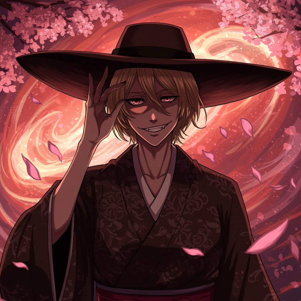 A charismatic portrait capturing the enigmatic allure of a character inspired by Urahara, set against a vibrant backdrop of swirling sakura petals and mystical energies; the figure is adorned in a wide-brimmed hat casting a shadow over mischievous eyes, a playful smirk revealing a hint of mystery, with their traditional, elegantly patterned kimono billowing gently as if caught in a soft breeze, embodying a fusion of modern style and timeless wisdom.
