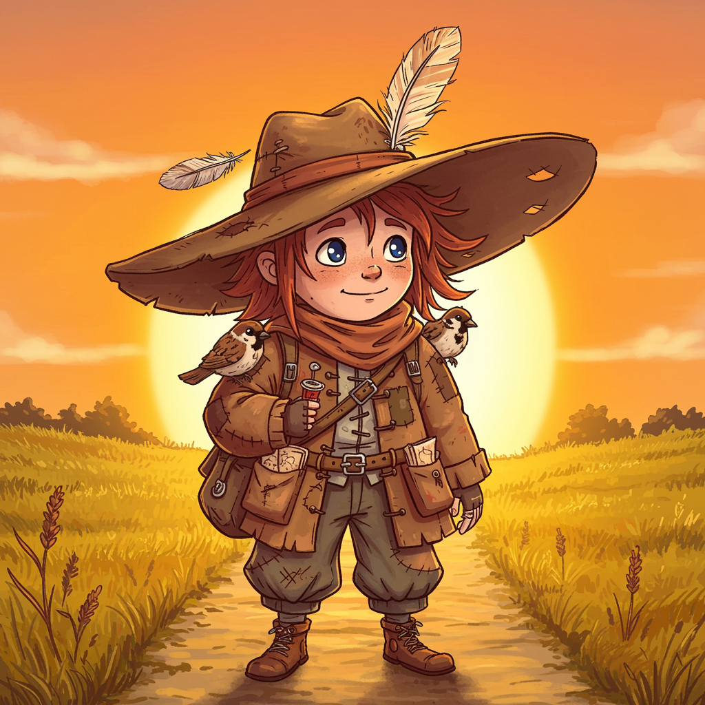 A whimsical vagabond character donning a wide-brimmed hat adorned with scattered feathers, the sun setting behind them casting an ethereal glow; their eyes twinkling with wanderlust and mischief, a tattered map peeking out from the pockets of a patchwork coat, while a tiny sparrow perches on their shoulder, all framed by the golden hues of a well-traveled path.