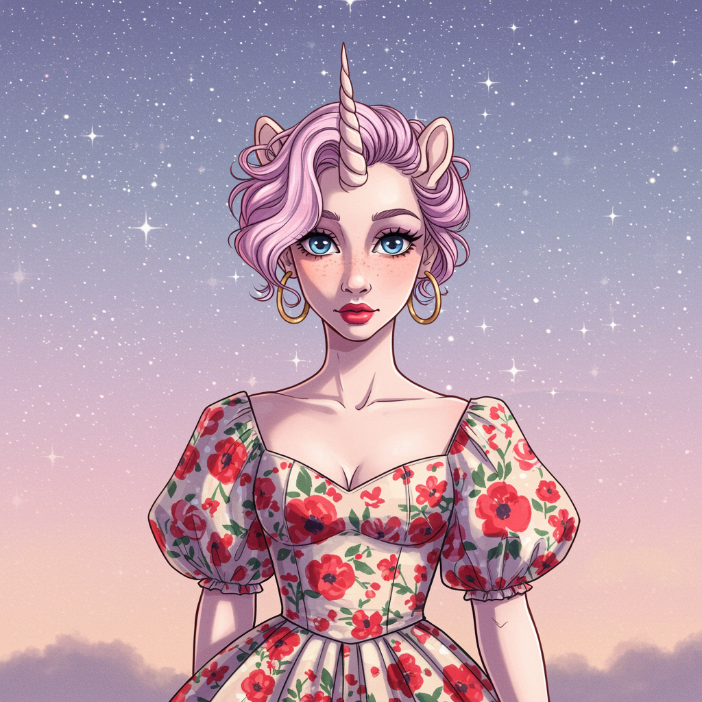 A whimsical digital portrait of a fashion-forward unicorn donned in an elegant Valentino-inspired gown adorned with vibrant floral patterns, set against a dreamy pastel backdrop of a starlit night sky, capturing the essence of style, magic, and individuality for a standout profile picture.