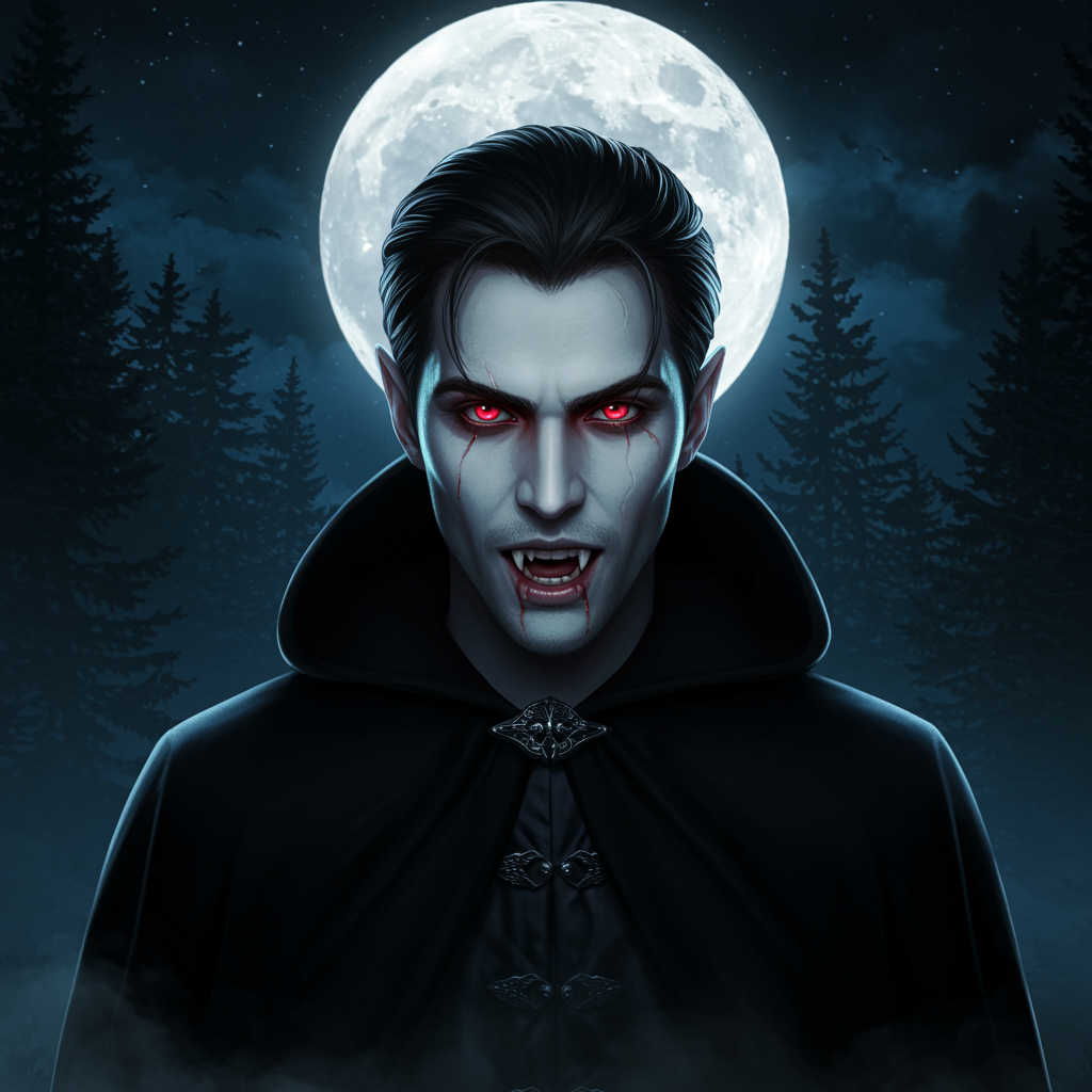 A mysterious vampire profile picture featuring a mesmerizing nocturnal scene: a strikingly handsome vampire with pale, marble-like skin and luminous crimson eyes, set against a backdrop of a full moon casting an ethereal glow over a dense, misty forest. His sharp fangs are subtly exposed, hinting at his eternal allure and enigmatic danger. He wears a flowing black cloak that seamlessly blends with the shadows, and his expression is a captivating blend of ancient wisdom and mischievous charm, exuding an irresistible, timeless allure.