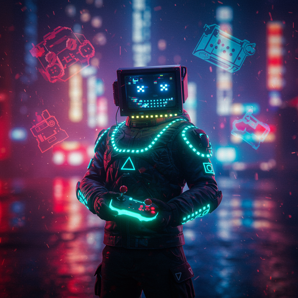 Imagine a vibrant, cyberpunk cityscape at night with neon lights casting colorful reflections on rain-soaked streets. In the foreground, a character with a pixelated mask resembling a glitching computer monitor stands confidently. They are clad in futuristic armor with LED accents, holding a controller shaped like a retro arcade joystick. In the background, digital specters of classic video game icons faintly appear in the air, creating an aura of nostalgia and modernity intertwined, perfectly capturing the essence of 'video game pfp'.