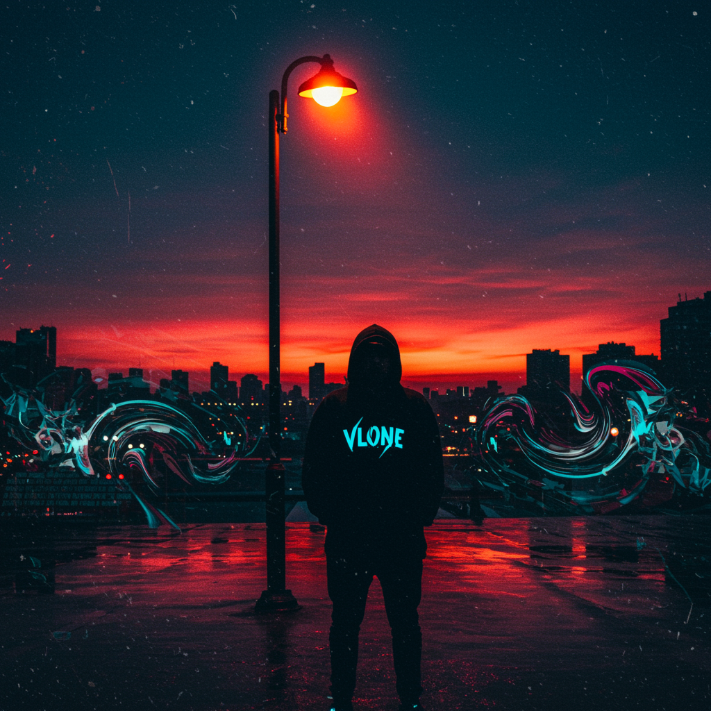 "Imagine a vibrant, urban scene reflecting a moody sunset with a solitary figure standing under a flickering streetlight. The figure is clad in a stylish, oversized Vlone hoodie, the bold logo partially illuminated by the neon glow of distant city lights. The background is a swirling collage of graffiti art, blending seamlessly into abstract shapes and patterns. This scene encapsulates a sense of individuality and mystery, capturing a persona that balances between the shadows and the vivid colors of street culture, evoking a sense of edgy independence perfect for a captivating profile picture."