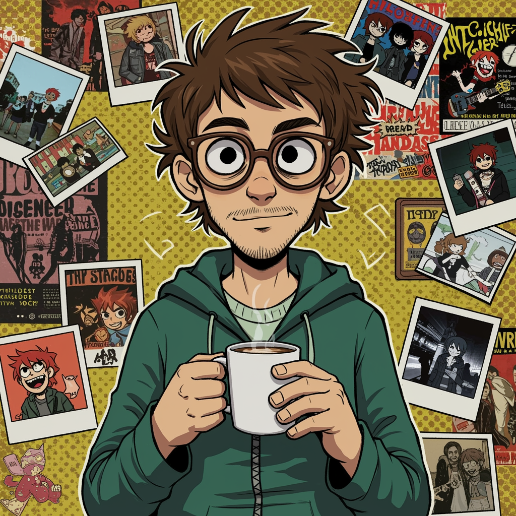 "Imagine a vibrant, comic-inspired profile picture capturing the essence of Wallace Wells, Scott Pilgrim's witty and sarcastic roommate, set against a backdrop of swirling indie band posters. Wallace, with his trademark disheveled hair and thick-rimmed glasses, gives a knowing, playful smirk, while holding a steaming cup of coffee. Around him, scattered polaroids show snippets of spontaneous adventures, filled with laughter and a hint of mischief, reflecting his charismatic persona and love for life's quirky moments."