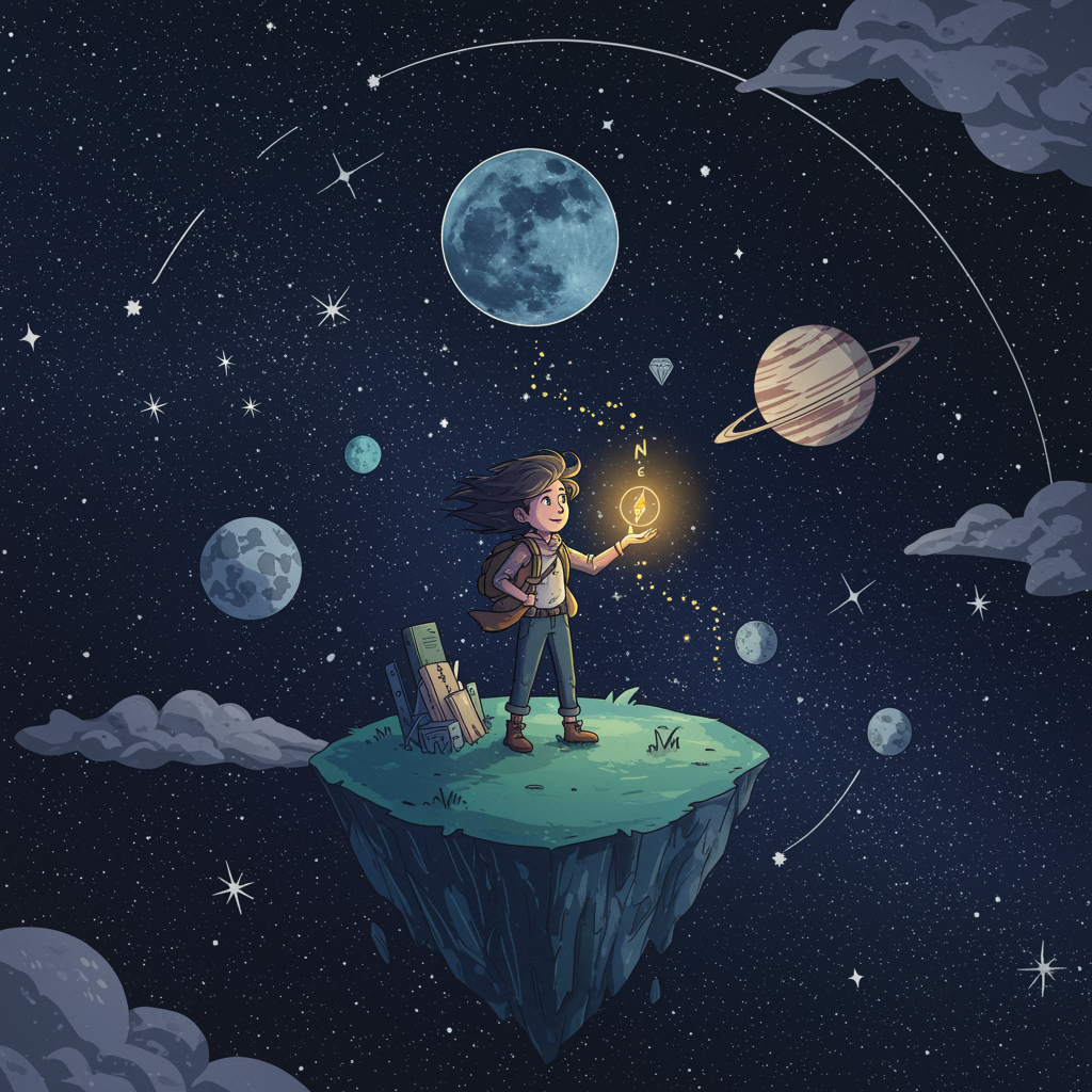 A whimsical profile picture depicting a wanderer on a surreal journey; a young adventurer with windswept hair stands on a floating island amidst a sea of stars, holding a glowing compass that points in the direction of drifting celestial bodies, the vast cosmic expanse reflecting in their eyes, embodying a spirit of boundless exploration and curiosity.