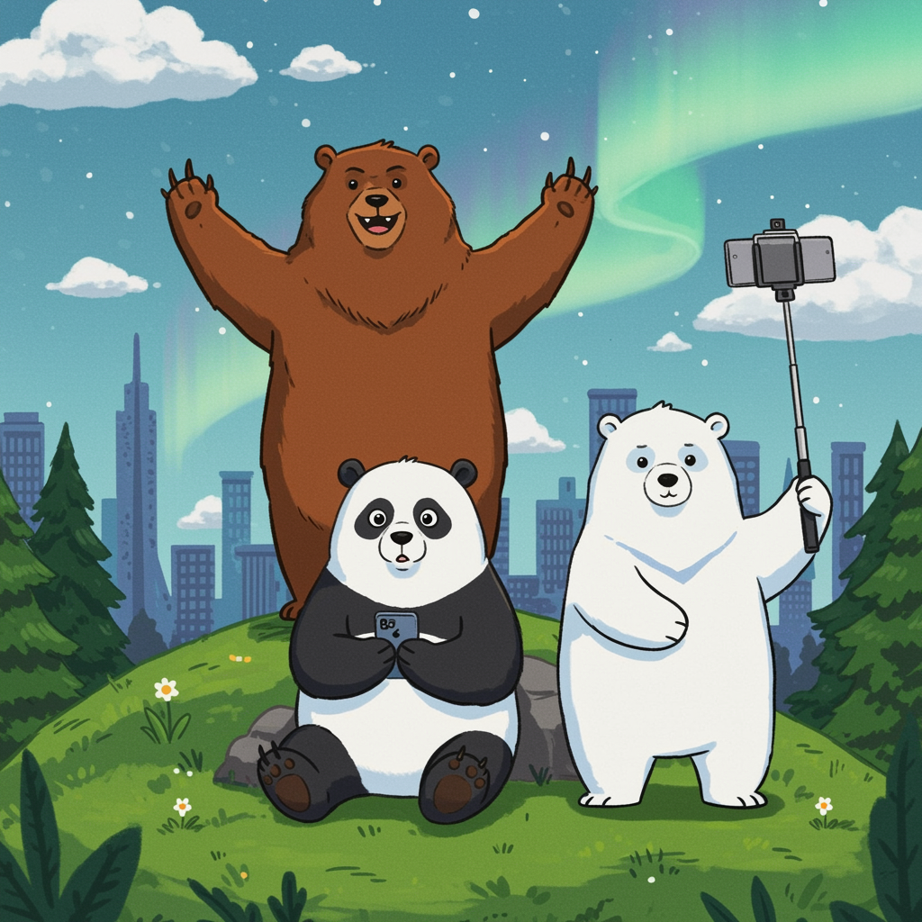Imagine a playful scene with a trio of cartoon bears, each exuding their distinct personalities: Grizzly, the enthusiastic leader, stands proudly atop a sunlit hill, his charismatic grin inviting you into their world; Panda, the soft-hearted and tech-savvy bear, is seated beside him, glued to his smartphone with wide, curious eyes reflecting a rainbow of social media icons; and Ice Bear, the enigmatic yet adorable character, is striking a ninja pose in the background with a serene expression, wielding a selfie stick like a sword, ready to capture the most epic pfp adventure. The setting is a whimsical blend of their urban meets nature habitat, where towering city skyscrapers meet lush forest canopies, under a sky splattered with cotton-candy clouds and the faint glow of a social media-inspired aurora borealis.