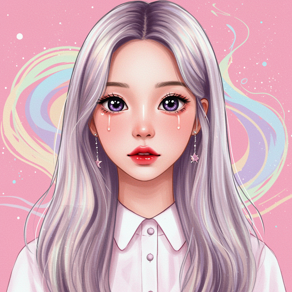 Imagine a whimsical, anime-inspired digital portrait of a striking and ethereal young woman named Wonyoung, captured in a moment of serene confidence. Her large, expressive eyes glisten like melting stars, while her silken hair cascades like a magical waterfall, holding hues of iridescent pastels that dance in a soft breeze. Her expression is a blend of playful curiosity and quiet wisdom, embodying the spirit of both a dreamer and a thinker. The background swirls with vibrant abstract patterns that convey a sense of infinite possibilities, hinting at the boundless imagination and creativity that Wonyoung represents in the digital realm.