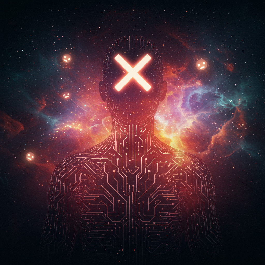 "Imagine a surreal profile picture featuring a figure with a glowing 'X' symbol as their face, set against a backdrop of swirling nebulae that blend a spectrum of colors, where each color represents a different emotion; intricate patterns reminiscent of digital circuitry trace the contours of their silhouette, connecting elements of nature and technology in perfect harmony."