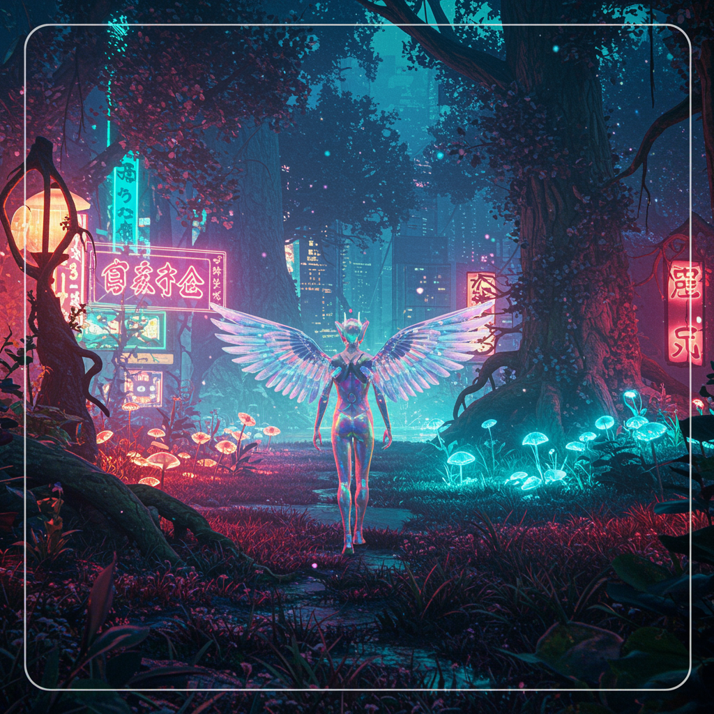 Create a fantastical profile picture featuring a surreal landscape where a cyberpunk city meets an enchanted forest; vivid neon lights intertwine with luminescent flora, and in the foreground, a mysterious figure with iridescent skin and glistening digital wings pauses mid-step, casting a knowing smile as if inviting viewers into this extraordinary fusion of nature and technology, embodying a whimsical blend of past and future.
