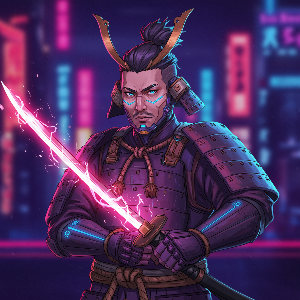 A vibrant digital illustration of a futuristic samurai named Yamato, featuring a sleek armor blending traditional Japanese elements with cyberpunk aesthetics; set against a backdrop of glowing neon cityscapes, the samurai holds a katana infused with pulsating energy, while their eyes reflect a determined and enigmatic gaze, capturing their essence in a powerful and unique profile picture.