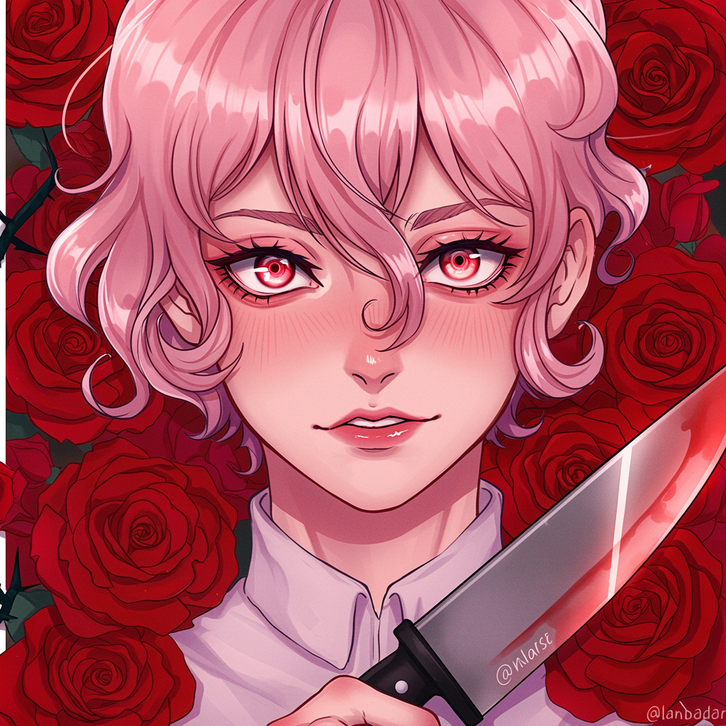 A vivid anime-style portrait featuring a character with striking, intense eyes that shift between a loving gaze and a menacing glare, set against a background of crimson roses with subtle hints of shadowed thorns; their expression is a captivating blend of innocence and obsession, symbolizing the duality of a yandere's love; soft curls frame their face, contrasting with the sharpness of a concealed shiny knife partially visible at the edge of the frame; the color palette is a mixture of pastel pinks and deep reds, creating a dissonance that reflects the character's unsettling charm and unpredictability.