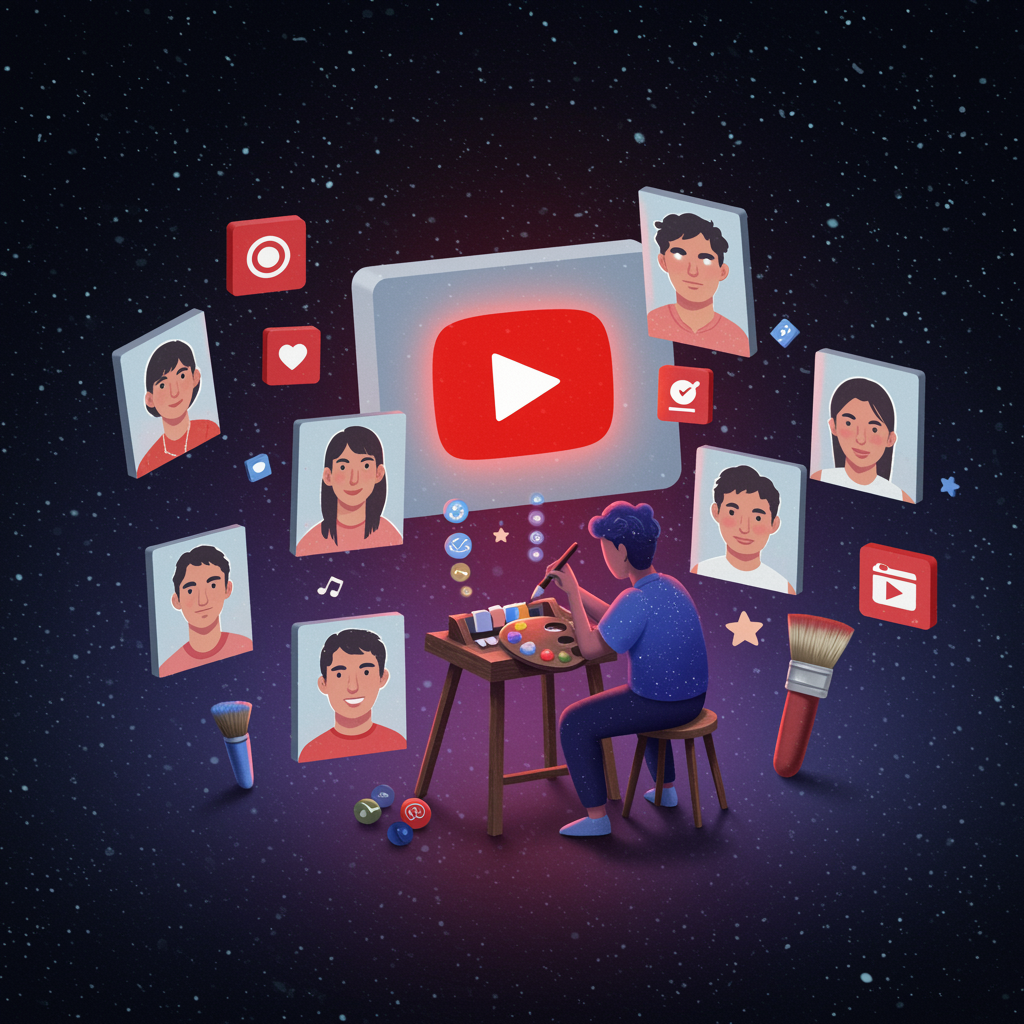 A vibrant, dream-like image depicting a cosmic artist crafting intricate profile pictures in a miniature celestial workshop; surrounded by floating icons and digital brushes, the artist brings to life a gallery of unique, radiant faces, each reflecting diverse interests and personalities, set against a backdrop of the iconic play button of YouTube illuminating the scene with its familiar red glow.