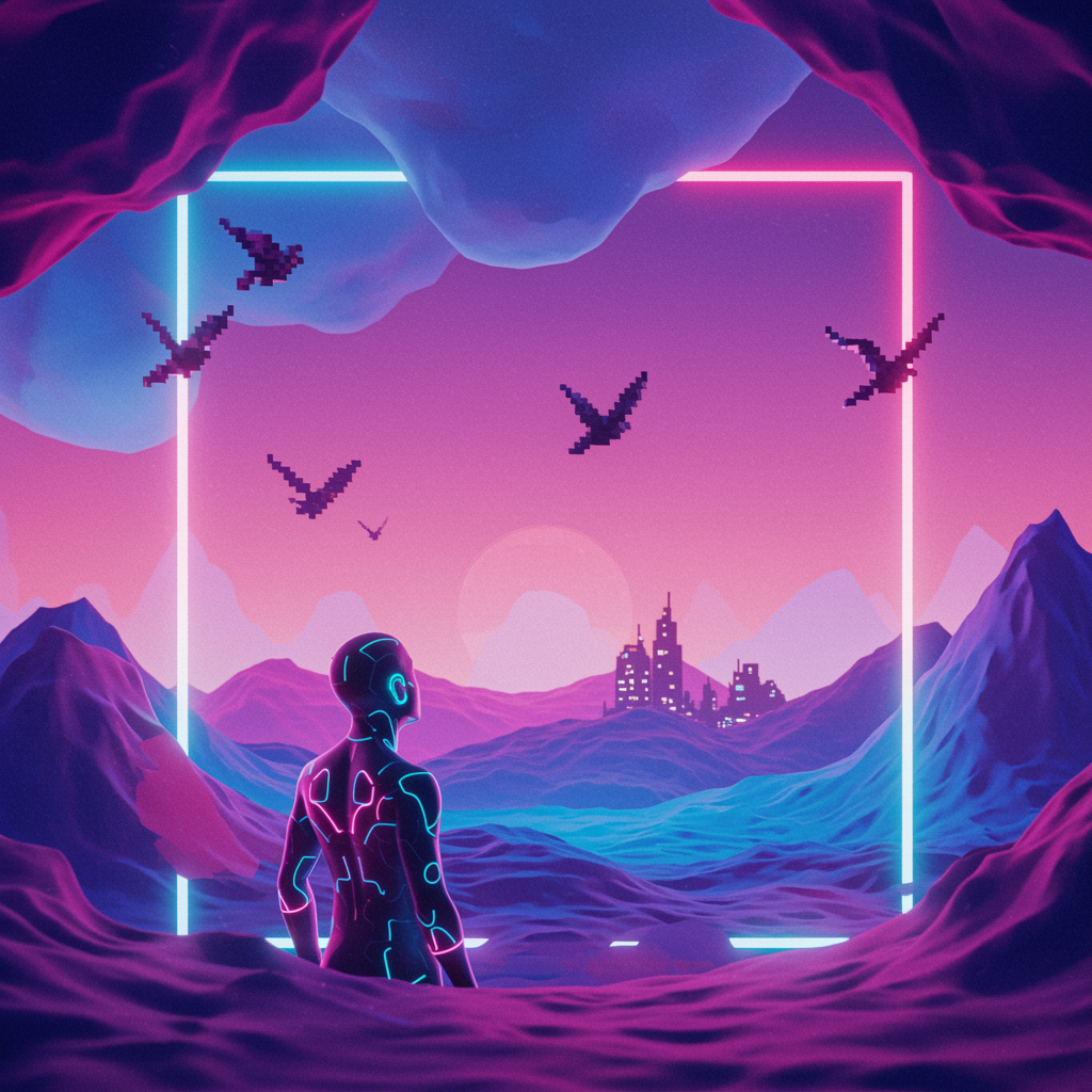 Create an imaginative profile picture that captures the essence of individuality and digital identity, featuring a vibrant and surreal landscape where abstract elements blend seamlessly into the background, symbolizing the interconnectedness of the virtual world. In the foreground, a futuristic avatar with neon accents is gazing towards the horizon, embodying both a sense of wonder and presence, while pixelated birds take flight, representing the freedom of expression in social media. The entire scene is encapsulated within a 800x800 pixel frame, optimizing clarity and focus to make it an ideal choice for a YouTube profile picture.