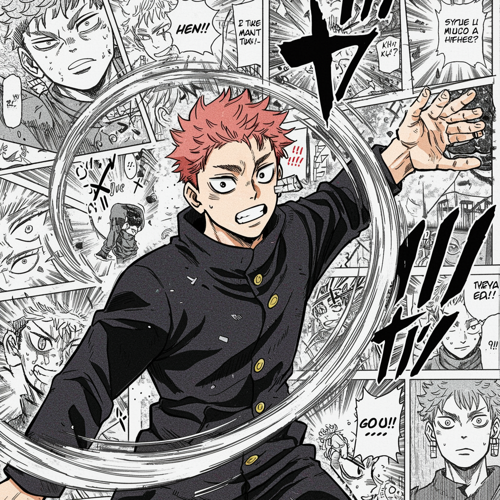 Create a profile picture featuring Yuji from a manga, capturing his spirited essence and dynamic energy. Illustrate him with an expressive pose surrounded by swirling manga panels, highlighting intense emotions and pivotal moments from his story. The background should be a fusion of bold lines and contrasting shades, reflecting the dramatic and artistic style typical of manga, while focusing on Yuji's determined gaze and iconic features.