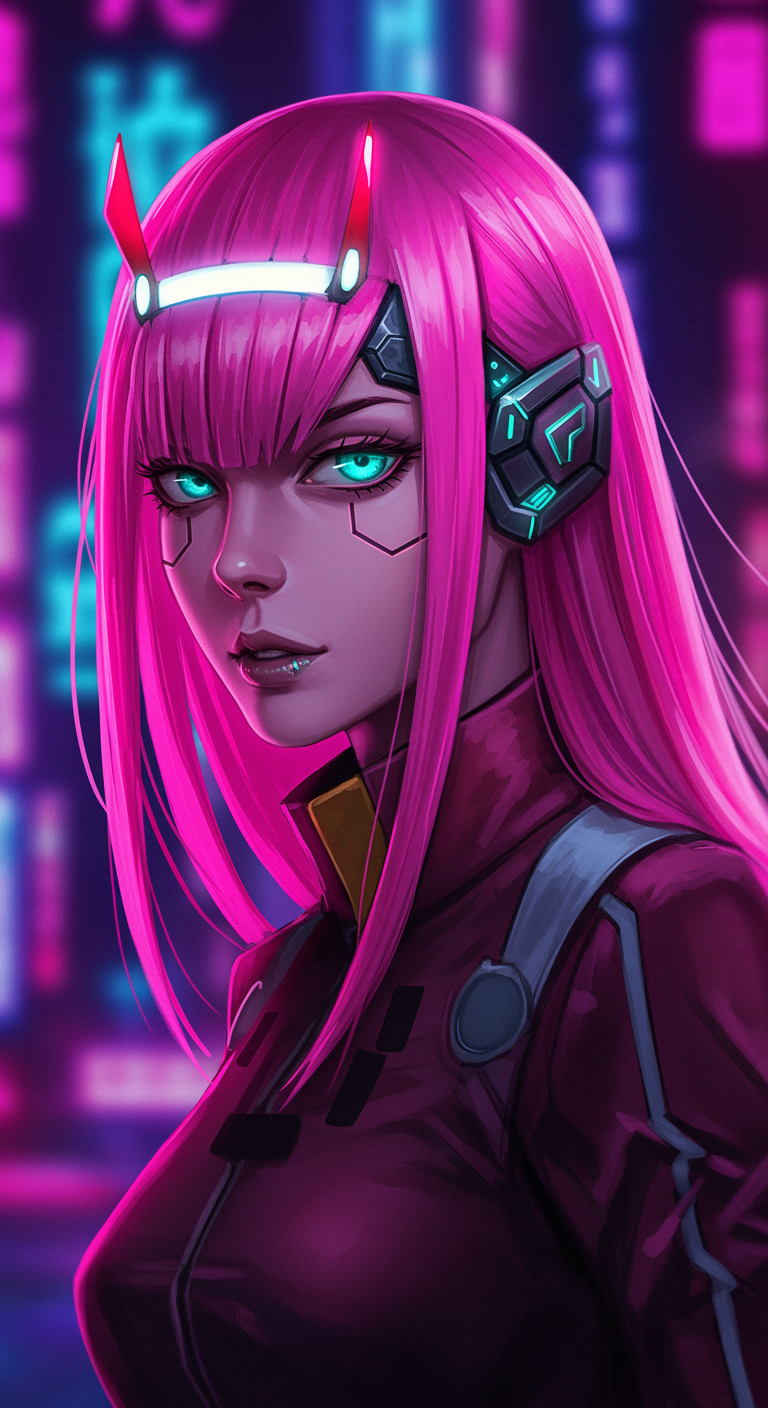 A dynamic and striking digital artwork featuring a futuristic character inspired by Zero Two, with vibrant pink hair flowing wildly and piercing blue eyes that capture a haunting intensity, adorned with a sleek, cybernetic headpiece glowing softly, set against a backdrop of neon-lit cityscape that reflects the character's enigmatic and alluring persona.