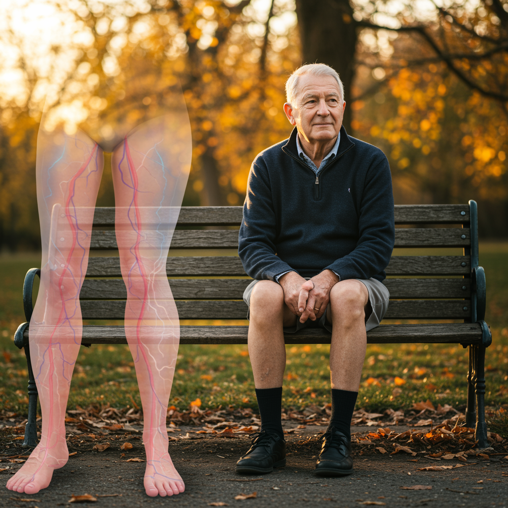 In a serene park setting, an elderly man sits on a weathered bench, his expression thoughtful yet serene. Around him, a series of translucent, ethereal overlays depict the subtle manifestations of poor blood circulation in the legs: a slightly swollen ankle wrapped in a gentle rose hue, cool skin with a delicate blue shimmer, and faint, barely visible spider veins weaving intricate patterns. The light is golden, casting a warm glow on the scene, and a soft breeze rustles the autumn leaves, hinting at change. This image encapsulates the silent whispers of the body, urging awareness and reflection, as nature and health intertwine in a moment of quiet introspection.