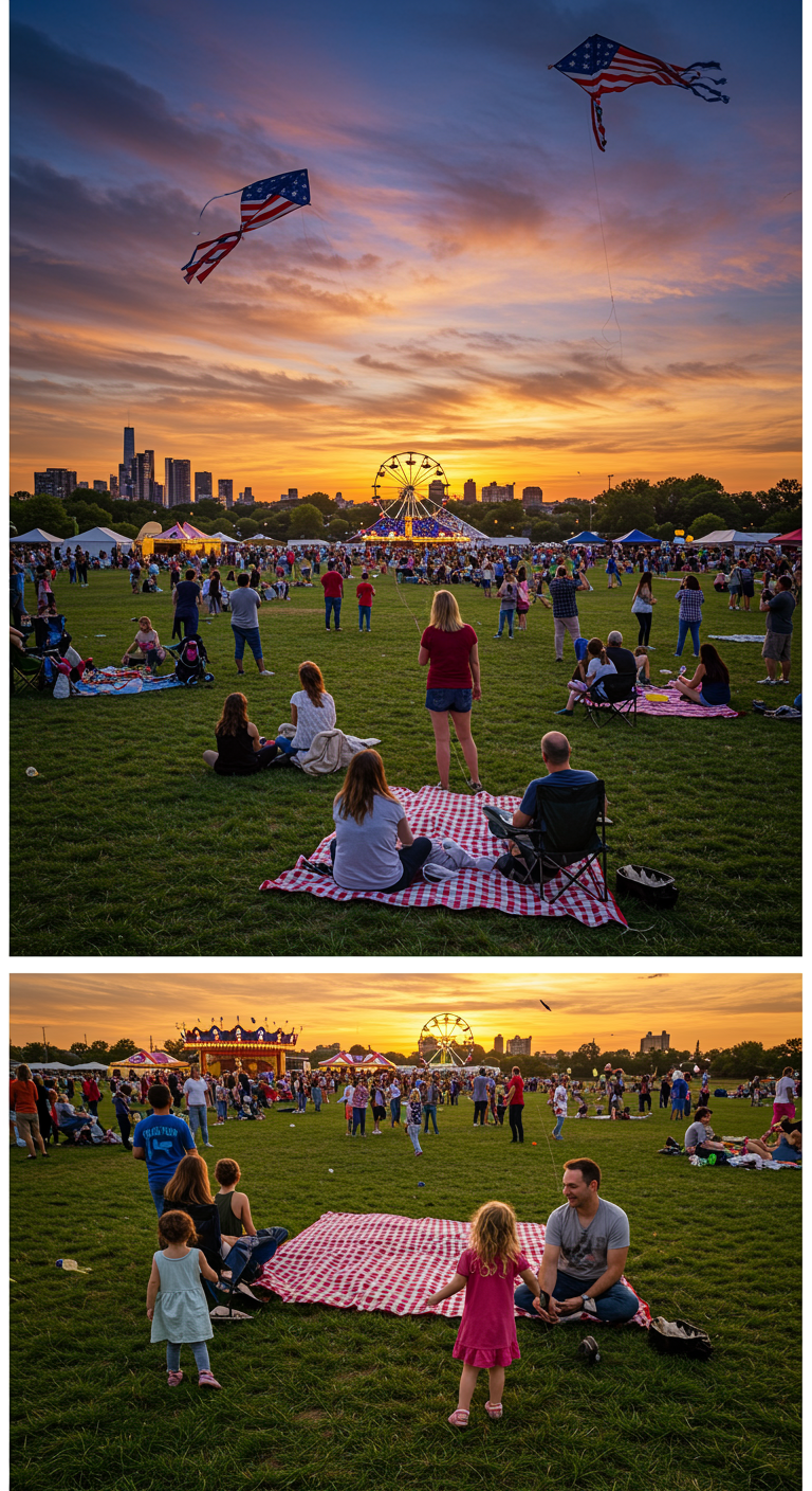Capture the essence of the American dream within the serene beauty of the Meadowlands: visualize a bustling carnival setting amidst expansive green fields, where families gather under a vibrant sky painted with streaks of sunset colors. Encapsulate the spirit of happiness and aspiration as children fly kites that mirror the stars and stripes, while couples enjoy a picnic on checkered blankets, and distant city lights begin to twinkle like dreams on the horizon. The scene should reflect the harmony between urban opportunity and the tranquility of nature, with a touch of nostalgic Americana that evokes the promise of new beginnings and cherished memories.