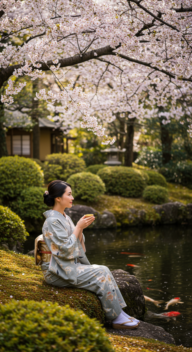 Sunlit tea garden in the heart of Kyoto, where a serene, elegantly dressed woman in a traditional kimono sits gracefully under a cherry blossom tree, sipping tea and gazing thoughtfully at the koi pond nearby; her tranquil expression and the gentle cascade of cherry petals capture the timeless beauty and rich cultural tapestry of the moment.