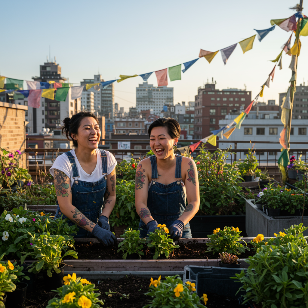 A sunlit rooftop garden in a bustling Asian city where two women, partners in love and life, are caught in a candid moment of shared laughter as they plant flowers together, their matching tattoos peeking out from under rolled sleeves, symbolizing unity and pride; the vibrant cityscape behind them tells stories of tradition blending with modernity, while colorful prayer flags flutter gently in the breeze, reflecting their harmonious blend of cultures and identities.