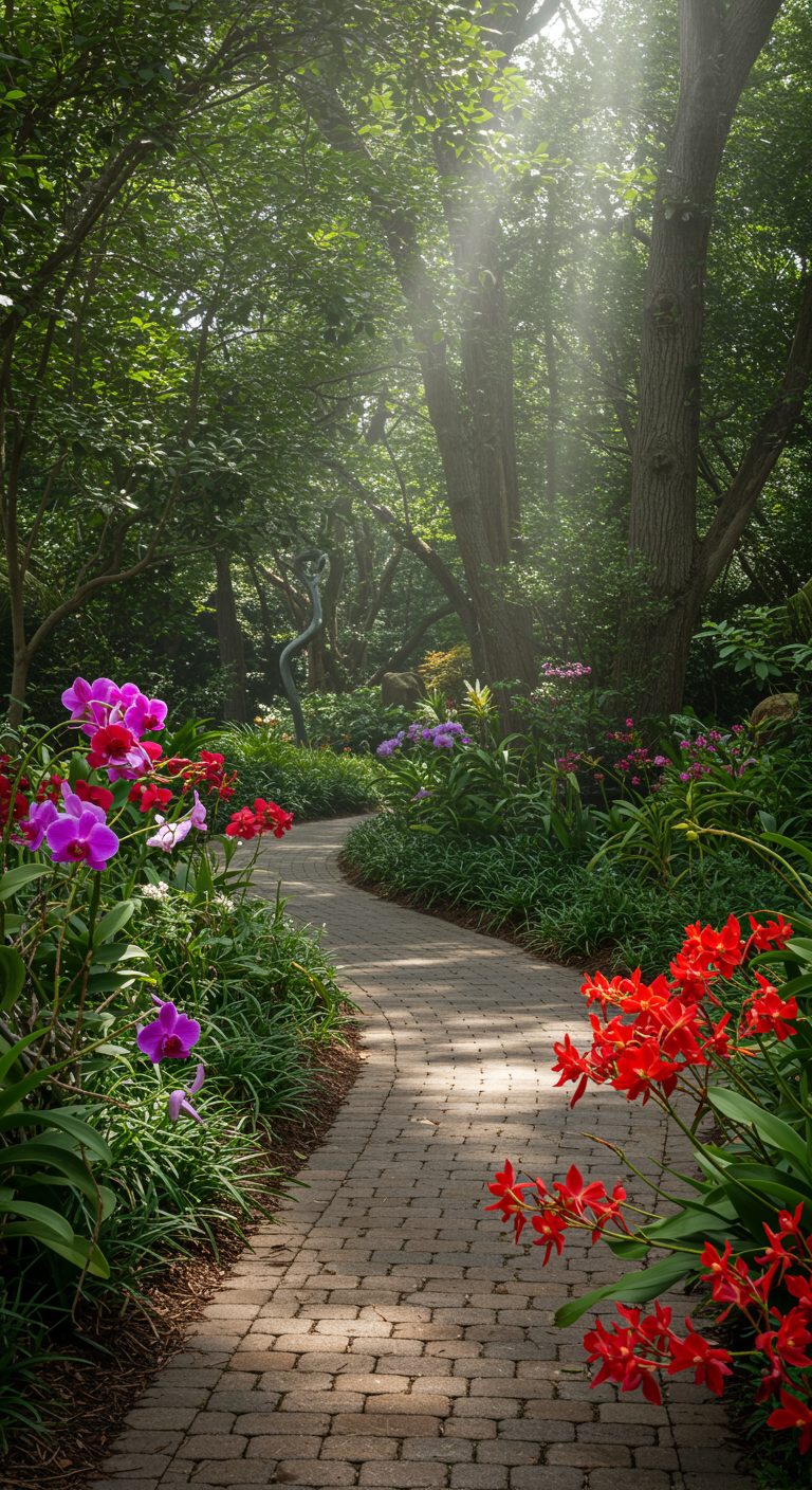 A sun-dappled afternoon in the Atlanta Botanical Garden, where vibrant bursts of colorful orchids bloom amidst lush foliage, a monarch butterfly delicately perched on a flaming-red cardinal flower, and soft sunlight filters through the canopy, casting ethereal patterns on the winding cobblestone paths, all while a gentle breeze carries the scent of jasmine and the distant laughter of children echoes from the outdoor sculpture maze, creating a serene and enchanting tableau of nature and human joy intertwined.