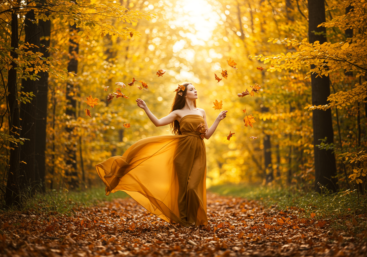 A whimsical autumn forest bathed in golden sunlight, where a serene female figure, draped elegantly in sheer, flowing fabrics that mimic the hues of fallen leaves, seems to merge with nature as delicate foliage dances around her, capturing a moment of ethereal beauty and natural harmony.