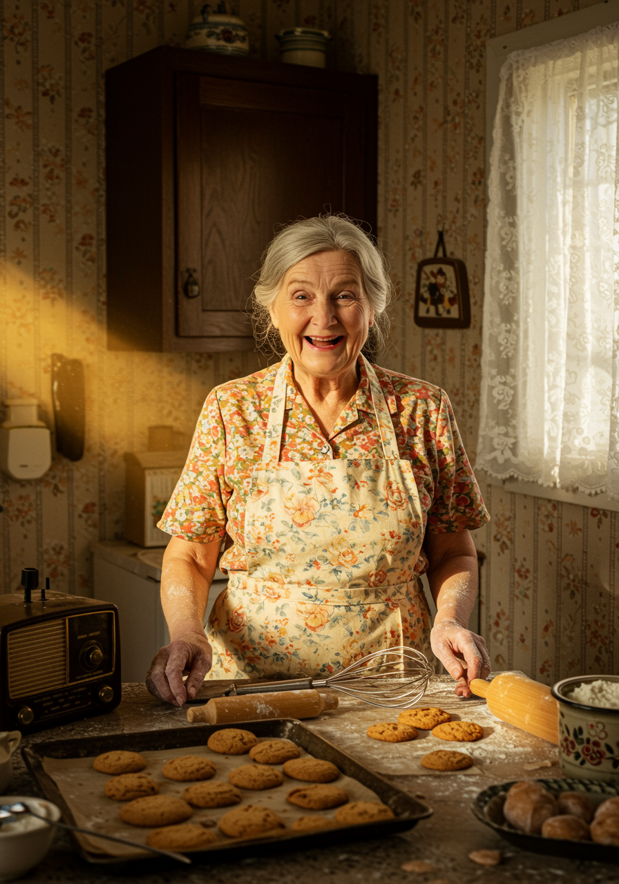 In a cozy, sunlit kitchen, a joyful bbw granny with twinkling eyes and a warm smile stands proudly. She’s wearing a floral apron dusted with flour, surrounded by a whirlwind of baking activity. Freshly baked cookies cool on the counter beside an old radio playing tunes from yesteryears. A golden sunlight beam filters through lace curtains, casting whimsical patterns on the vintage wallpaper and creating a nostalgic, heartwarming atmosphere.