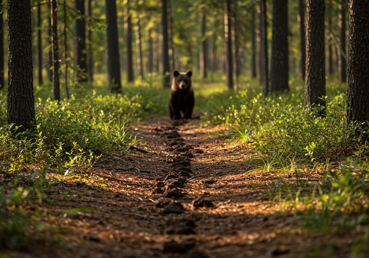Capture a serene woodland scene at dawn where a trail of fresh bear scat is naturally integrated into the forest floor, surrounded by dappled sunlight filtering through the canopy and casting playful shadows on the earth, while in the distance, a curious young bear is partially visible, glancing back as it moves silently through the underbrush, embodying the harmony and cycle of nature.