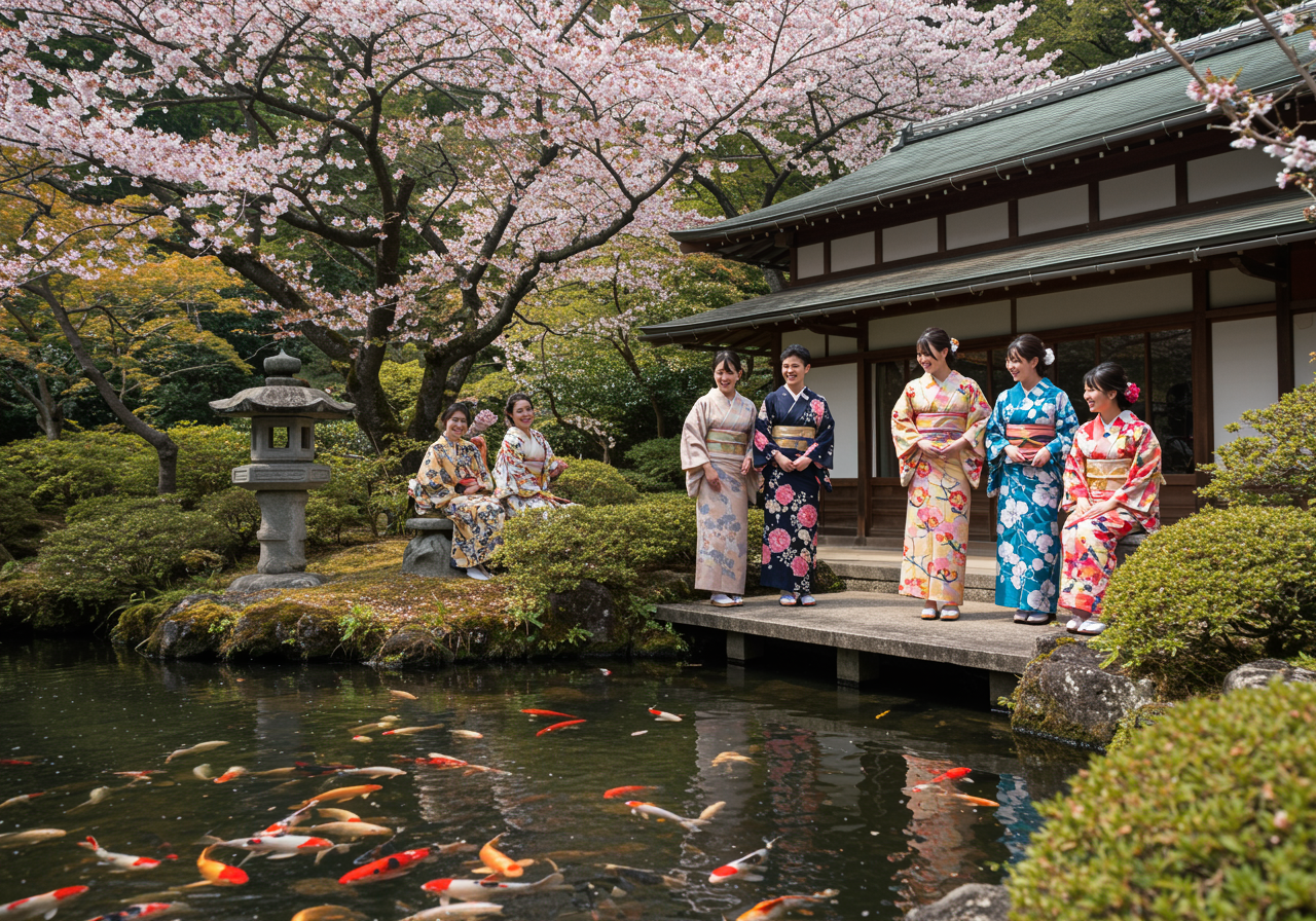 A serene moment at a tranquil Japanese tea garden where vibrant koi fish lazily swim through crystal-clear waters, cherry blossoms gently fall like delicate pink snow, and the traditional architecture harmonizes with nature; the scene is made lively by the joyful presence of a diverse group of friends, each in traditional attire, sharing laughter and stories, their colorful kimonos blending with the garden's lush foliage, capturing the essence of cultural richness and camaraderie.