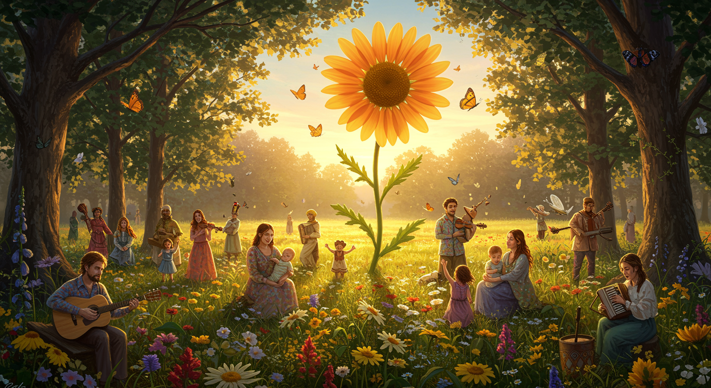 In the golden light of a late afternoon sun, a serene meadow unfolds where nature's grandeur meets human celebration. Centered is a whimsical scene where a giant flower, reminiscent of a vibrant daisy, stands tall with petals unfolding in magnificent bloom, each petal the size of a child's kite. Gathered around this floral marvel are people of various ages engaging joyfully in a peaceful festival, their colorful attire mirroring the kaleidoscopic array of wildflowers around them. Butterflies the size of dinner plates flit about, and the gentle giggles of children weave through the air as they play beneath the leafy canopy. Nearby, a mother with a serene smile gently cradles her baby, symbolizing the nurturing bond, while musicians strum guitars and play flutes, imbuing the scene with a sense of timeless harmony and natural abundance.