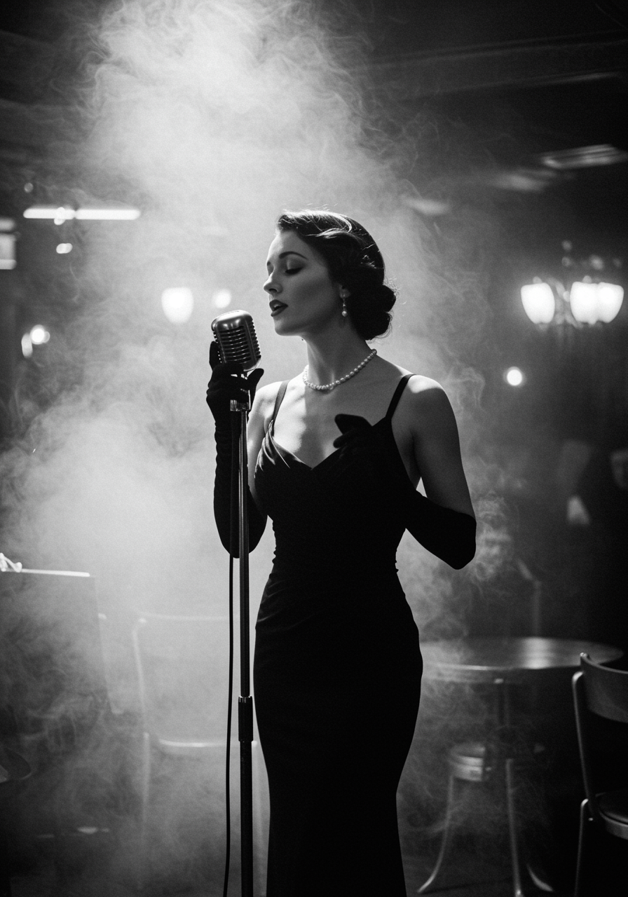 "A black-and-white photograph captures the intimate beauty of a vintage jazz club, where a female singer in a classic, elegant evening gown holds a sultry note; the camera focuses on her confident posture and the tasteful silhouette of her form, while the background blurs into an abstract tapestry of swirling smoke and dim, nostalgic lights, evoking a timeless sense of grace and allure."