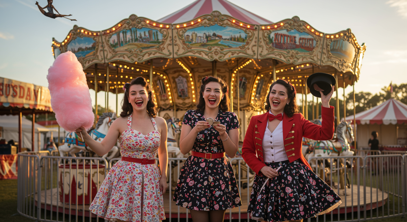 In a sun-drenched vintage carnival, vibrant with energy and swirling colors, a trio of confident women in playful, retro pin-up attire pose in front of a dazzling carousel. Their laughter fills the air as each one embodies a different persona: the daring trapeze artist with a wink, the mysterious fortune teller with a crystal ball, and the spirited ringmaster twirling a top hat. The scene, a whimsical tribute to old Hollywood glamour, is captured at the golden hour, casting a warm glow and accentuating the spirited camaraderie of these modern muses amidst a backdrop of cotton candy clouds and sparkling lights.