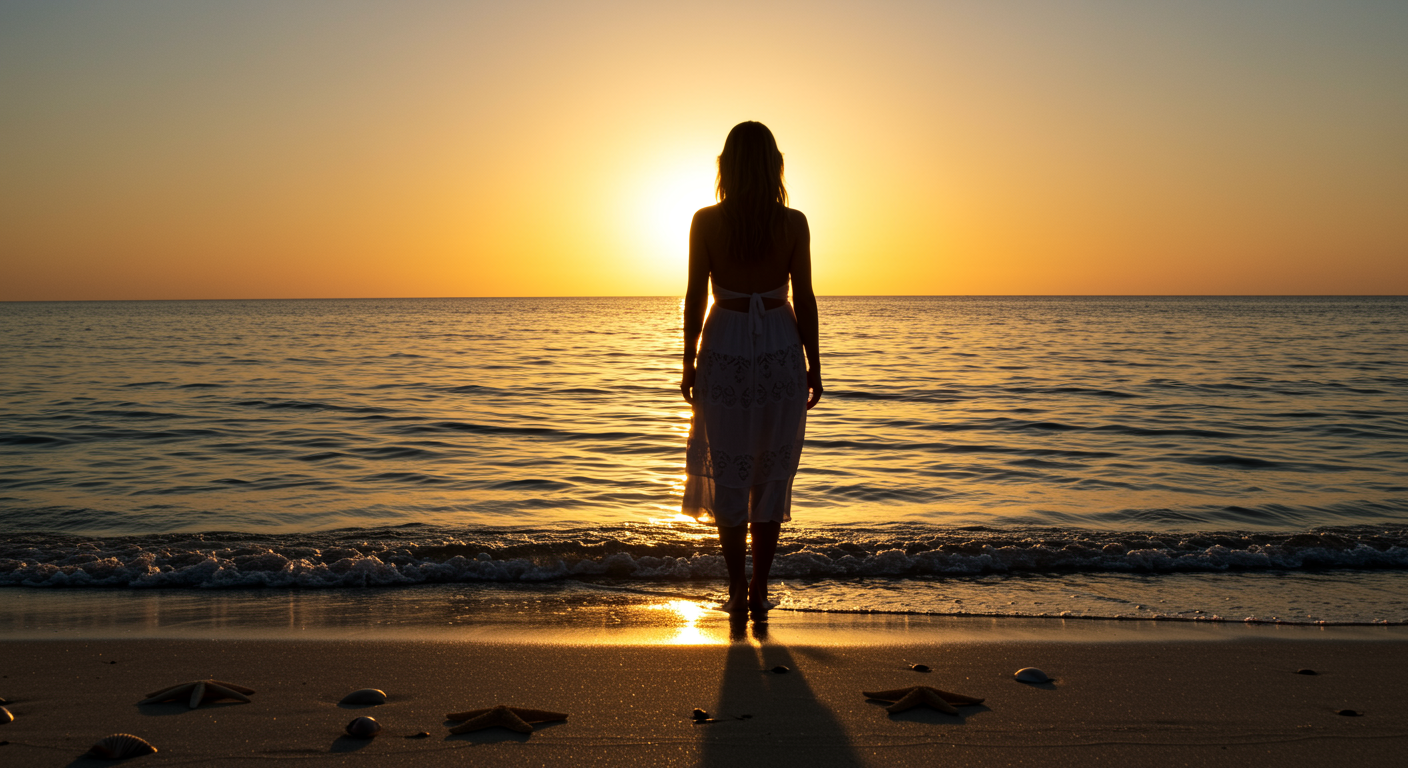 Sunset Serenity: A graceful silhouette of a woman, standing on a serene beach with her back to the camera, gazing towards the horizon where the sun kisses the ocean. Her presence is ethereal, reminiscent of a timeless goddess, with the natural beauty of the setting sun casting warm, golden hues over her. The gentle waves lap at her feet, symbolizing the merging of earth and water, while seashells and starfish dot the sand, adding whispers of the ocean’s secrets. The scene captures an intimate, yet respectful celebration of nature and human elegance, inviting viewers to ponder the profound connection between the two.