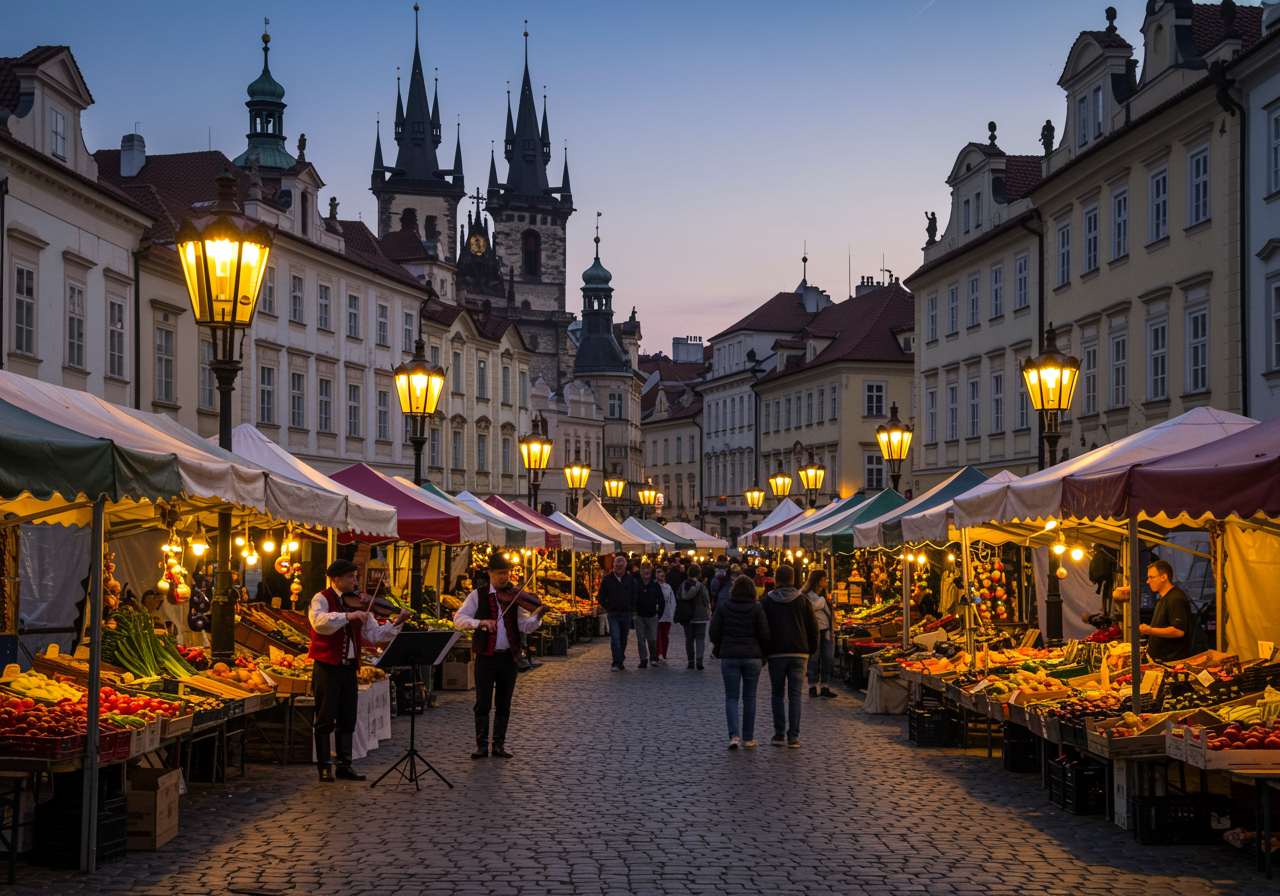 Capture a vibrant scene from a bustling Czech street market at twilight, where the golden glow of old-fashioned street lamps mingles with the lively chatter of vendors and locals. Cobblestone paths weave through colorful stalls brimming with fresh produce, handmade crafts, and aromatic spices. In the background, the baroque architecture of historic buildings is softly illuminated, providing a charming backdrop that echoes centuries of cultural richness. A street performer in traditional attire passionately plays a violin, adding to the enchanting atmosphere, while a couple strolls hand-in-hand, embodying the timeless romance of Czech street life.