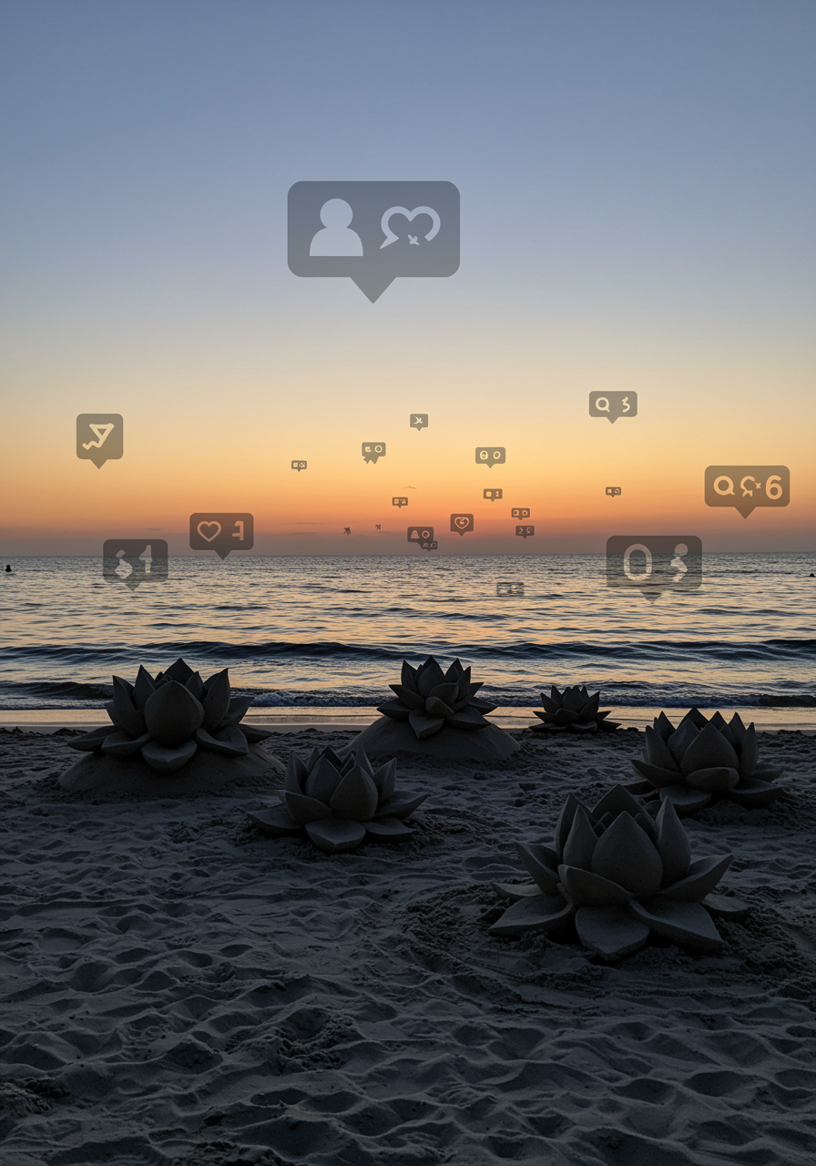Create a photograph that captures the essence of personal transformation and public perception through an artistic lens. Imagine a serene twilight beach scene where the gentle waves symbolize the ebb and flow of personal growth. In the foreground, a series of sand sculptures intricately shaped as blooming lotuses rise from the shoreline, each petal catching the soft hues of the setting sun. In the background, faint silhouettes of social media notifications float in the sky like ephemeral clouds, representing the fleeting nature of online fame and visibility. This image should evoke a sense of introspection, representing how individuals navigate the dual worlds of personal identity and public persona.