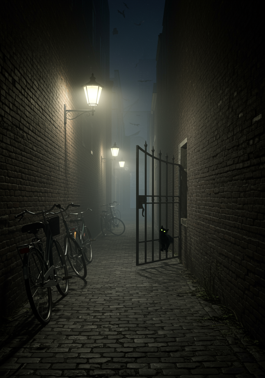 In the dim glow of a solitary streetlamp, a lonesome alleyway is shrouded in an eerie mist, casting long, ghostly shadows of abandoned bicycles lining the brick walls; a half-opened, creaky iron gate leads to a mysterious cobblestone path, where the faint silhouette of a black cat slinks into the depths of darkness, with glowing eyes and an air of ancient secrets whispering through the cold, damp air.